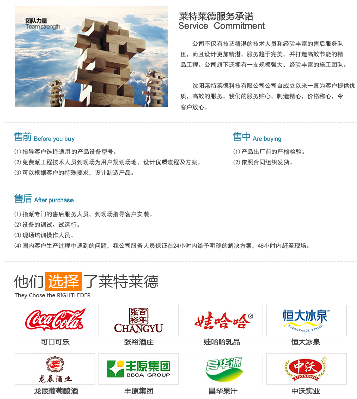 萊特萊德公司擁有一批長期從事水處理技術(shù)開發(fā)、研究、應(yīng)用,實(shí)踐經(jīng)驗(yàn)豐富的優(yōu)秀的工程技術(shù)人員,為客戶提供從設(shè)計規(guī)劃、設(shè)備選購、施工安裝到售后質(zhì)量的高品質(zhì)、高可靠性的全面解決方案與服務(wù)。其質(zhì)量和售后服務(wù)受到用戶的廣泛好評。本公司本著“優(yōu)質(zhì)、高效、創(chuàng)新、求實(shí)” 的宗旨。盡量在短時間內(nèi)為客戶提供好的服務(wù)。爭取每一個客戶成為宣傳公司過硬技術(shù)與優(yōu)質(zhì)服務(wù)的平臺。7sR純凈水設(shè)備_山泉水設(shè)備_礦泉水設(shè)備—萊特萊德水廠設(shè)備【始于1998】